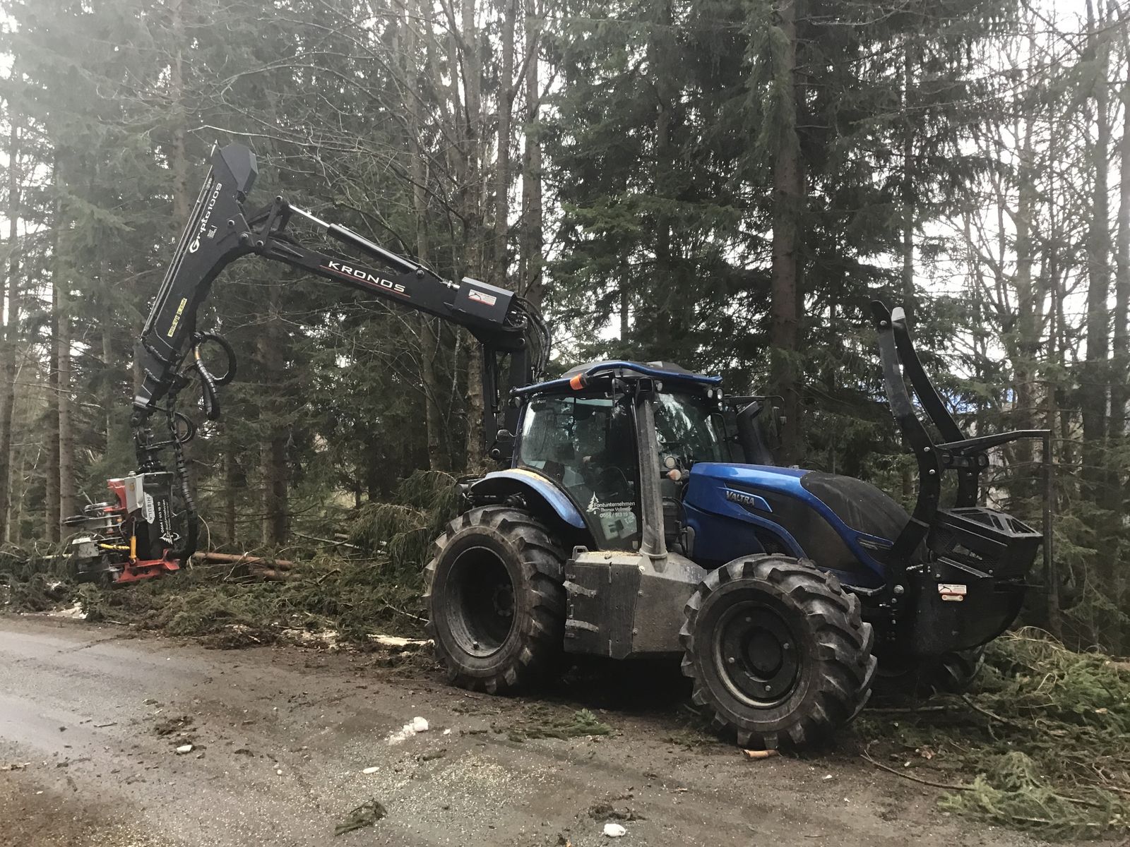 Valtra T174D mit Kran Kronos Gripto 1009 und Harvester Nisula 500 H - Valtra T174 D – Baujahr 2021, B-Std. 3900